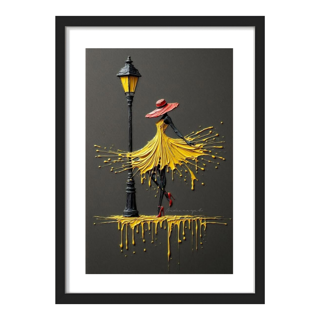 Palette: The high contrast is striking. The dark, matte background makes the luminous yellow of the gown and the lamp’s light pop, accented by the bold red of the hat and heels.