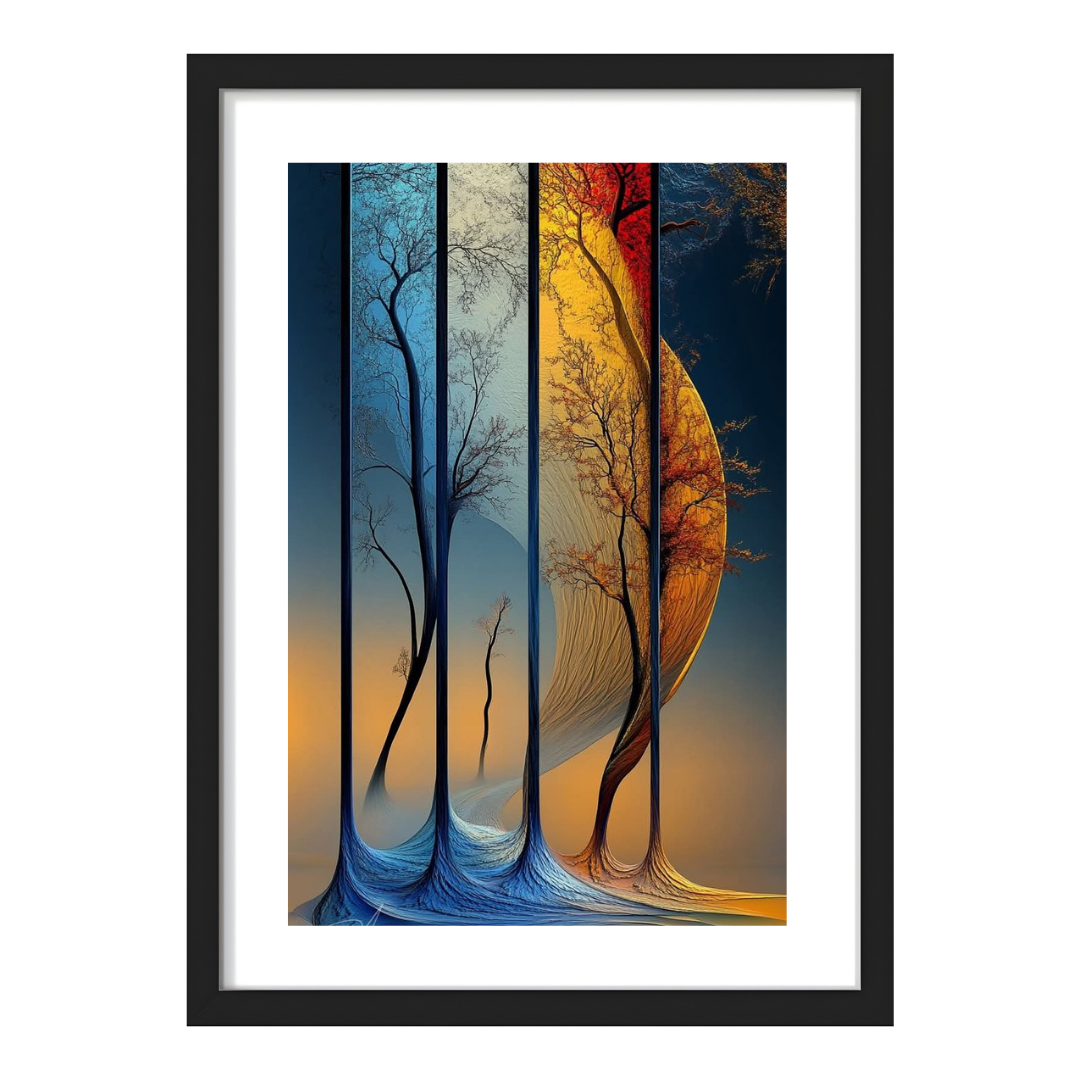 Colors & Theme: It depicts a transition of time and seasons. The left side is dominated by cool blues (representing winter, night, and stillness) with bare branches. As your eye moves right, the palette shifts to warm golds and russet oranges (representing autumn, sunset, and energy) with vibrant foliage.