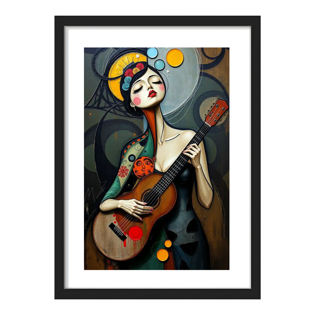 • Subject: A stylized female musician playing an acoustic guitar. Her eyes are closed, and her head is tilted on an elongated neck, conveying a state of deep immersion and serenity.