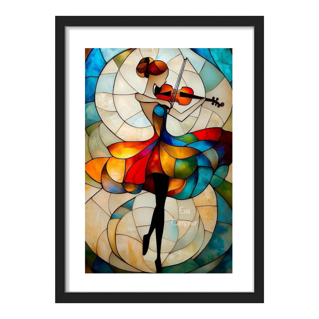 Palette: The artwork is a kaleidoscope of colors. The musician’s dress is a brilliant mix of fiery reds, sunny yellows, and deep blues. The background features swirling circular patterns in pale blues and whites, resembling light fracturing through glass.